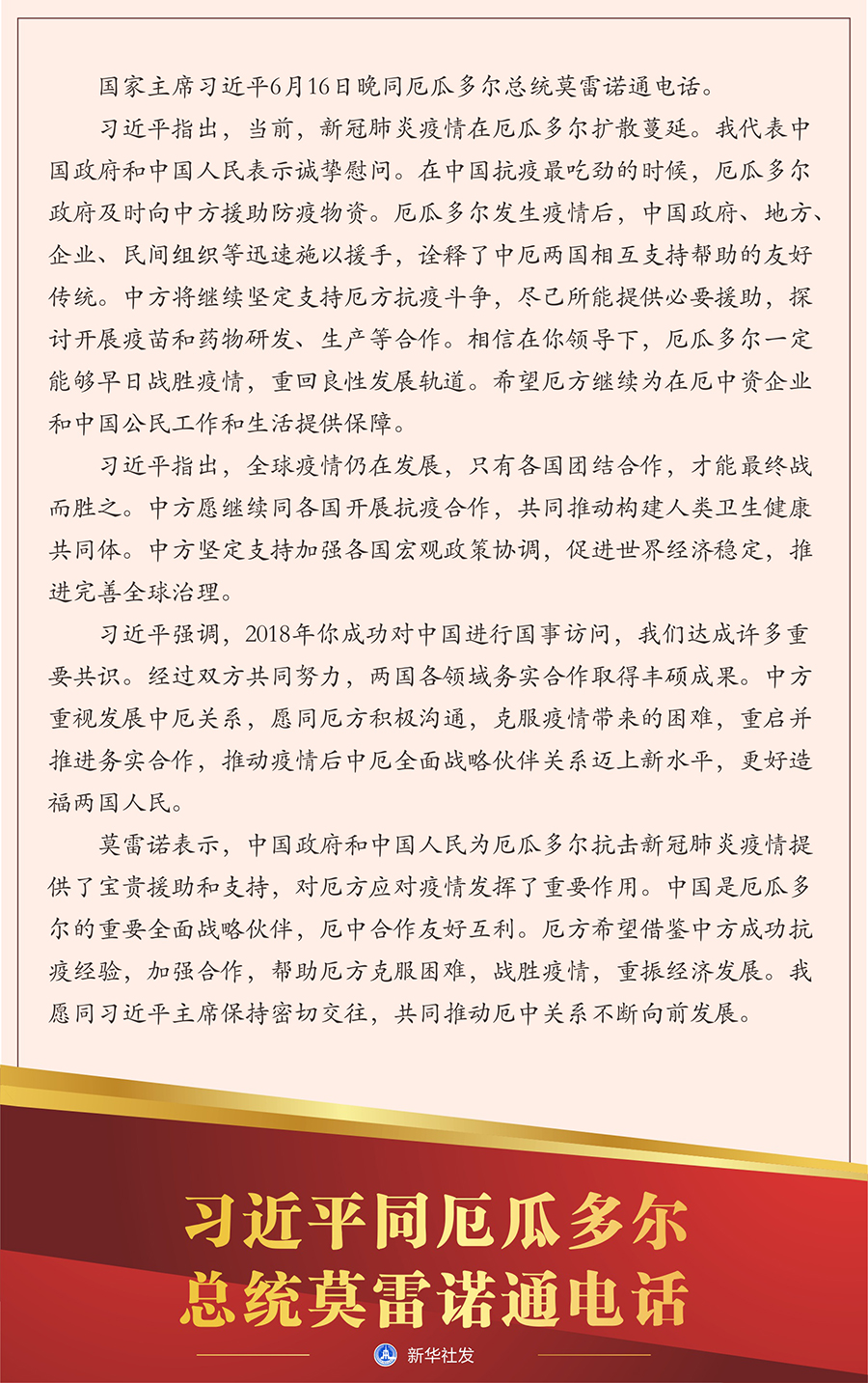 新華社北京6月16日電? 國家主席習近平6月16日晚同厄瓜多爾總統(tǒng)莫雷諾通電話。