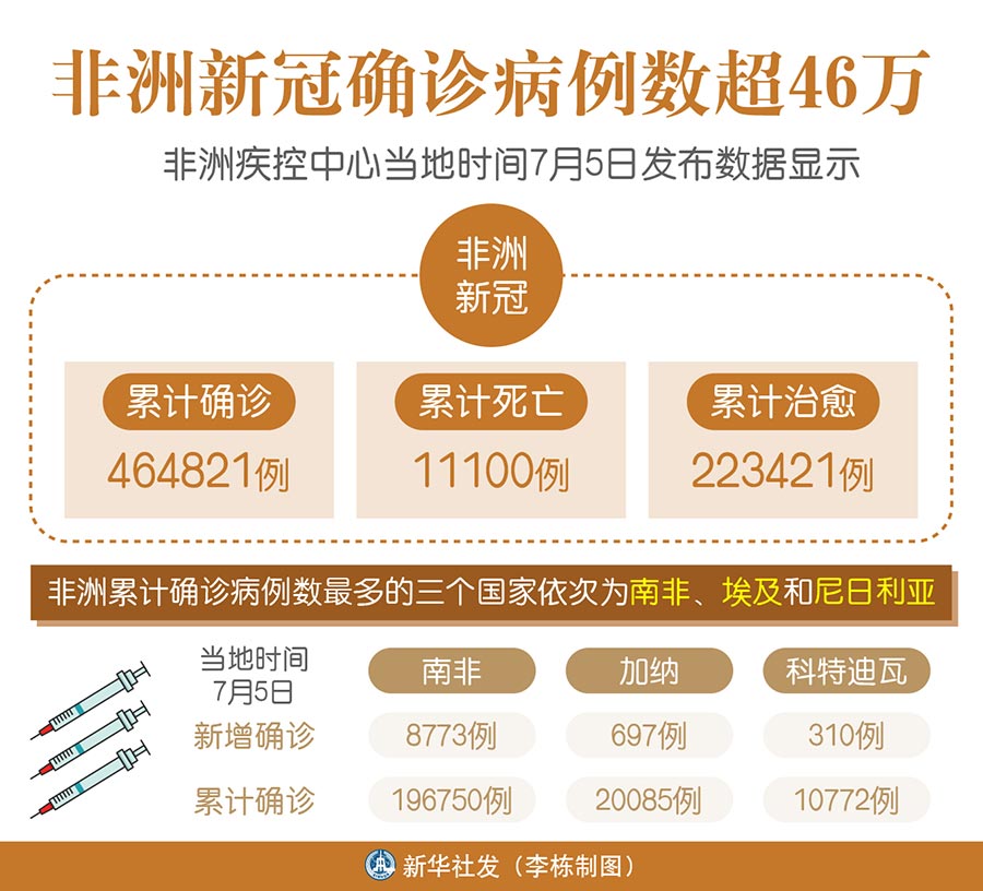 新華社阿比讓7月5日電 綜合新華社駐非洲地區(qū)記者報道:非洲疾控中心5日發(fā)布數(shù)據(jù)顯示,非洲累計新冠確診病例達464821例,累計死亡11100例,累計治愈223421例。