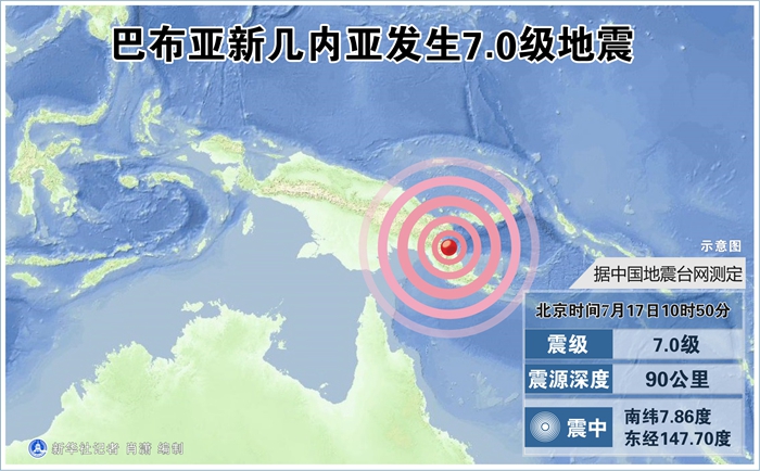 新華社快訊:中國地震臺(tái)網(wǎng)正式測定:7月17日10時(shí)50分在巴布亞新幾內(nèi)亞(南緯7.86度,東經(jīng)147.70度)發(fā)生7.0級(jí)地震,震源深度90千米。