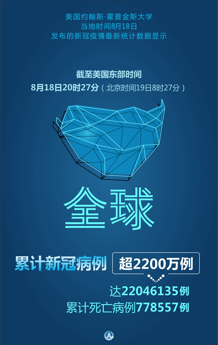 新華社紐約8月18日電? 美國約翰斯·霍普金斯大學18日發(fā)布的新冠疫情最新統(tǒng)計數(shù)據(jù)顯示,截至美國東部時間18日20時27分(北京時間19日8時27分),全球累計確診病例突破2200萬例,達22046135例,累計死亡病例778557例。