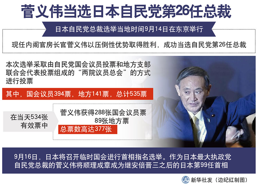 新華社東京9月14日電(記者郭丹)日本自民黨總裁選舉14日在東京舉行。現(xiàn)任內閣官房長官菅義偉以壓倒性優(yōu)勢取得勝利,成功當選自民黨第26任總裁。