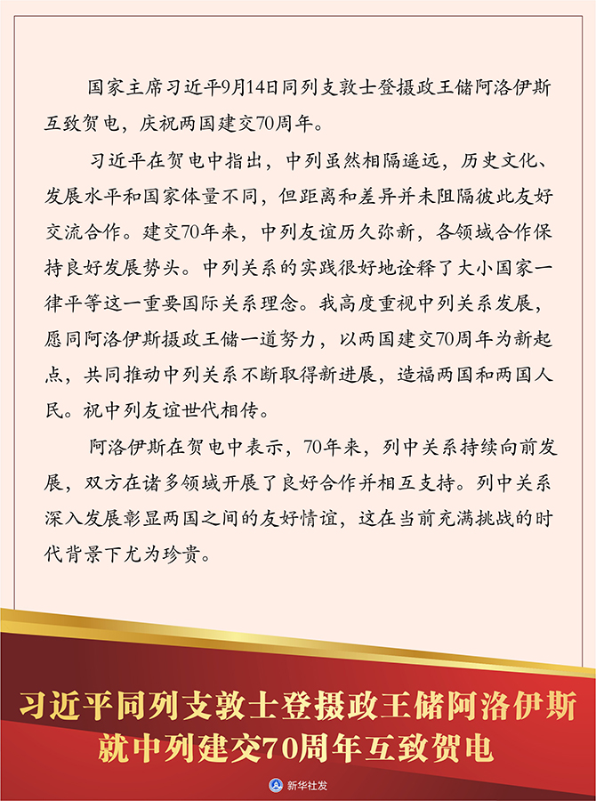 習(xí)近平在賀電中指出,中列雖然相隔遙遠(yuǎn),歷史文化、發(fā)展水平和國家體量不同,但距離和差異并未阻隔彼此友好交流合作。建交70年來,中列友誼歷久彌新,各領(lǐng)域合作保持良好發(fā)展勢頭。中列關(guān)系的實踐很好地詮釋了大小國家一律平等這一重要國際關(guān)系理念。我高度重視中列關(guān)系發(fā)展,愿同阿洛伊斯攝政王儲一道努力,以兩國建交70周年為新起點,共同推動中列關(guān)系不斷取得新進(jìn)展,造福兩國和兩國人民。祝中列友誼世代相傳。