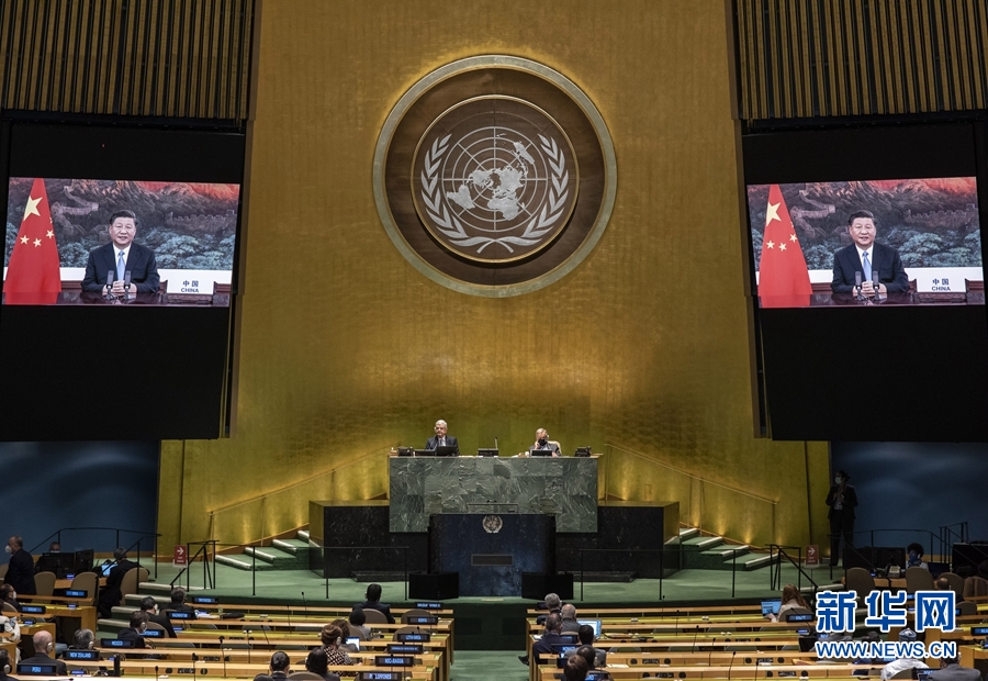 9月22日,國(guó)家主席習(xí)近平在第七十五屆聯(lián)合國(guó)大會(huì)一般性辯論上發(fā)表重要講話。 新華社發(fā)(聯(lián)合國(guó)供圖/埃瑟金德?tīng)枴さ仑愗?攝)