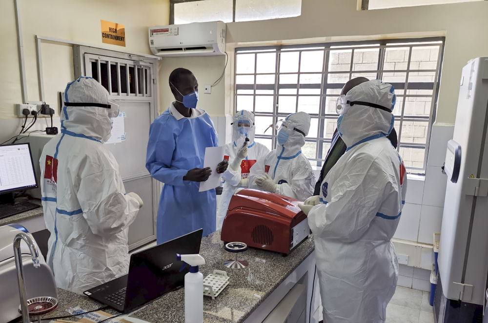 在南蘇丹首都朱巴的一處新冠病毒檢測機(jī)構(gòu),中國抗疫醫(yī)療專家組成員與南一線醫(yī)護(hù)人員交流(8月21日攝)。 新華社發(fā)(中國駐南蘇丹大使館供圖)
