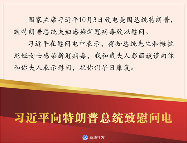 新華社北京10月3日電? 國家主席習(xí)近平10月3日致電美國總統(tǒng)特朗普,就特朗普總統(tǒng)夫婦感染新冠病毒致以慰問。