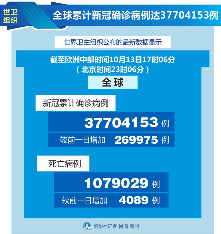 新華社日內(nèi)瓦10月13日電(記者劉曲)世界衛(wèi)生組織13日公布的最新數(shù)據(jù)顯示,全球累計新冠確診病例達37704153例。