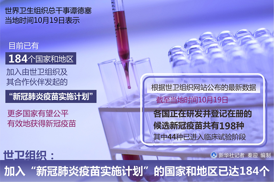 新華社日內(nèi)瓦10月19日電(記者聶曉陽 陳俊俠)世界衛(wèi)生組織總干事譚德塞19日表示,目前已有184個(gè)國(guó)家和地區(qū)加入由世衛(wèi)組織及其合作伙伴發(fā)起的“新冠肺炎疫苗實(shí)施計(jì)劃”,更多國(guó)家有望公平有效地獲得新冠疫苗。
