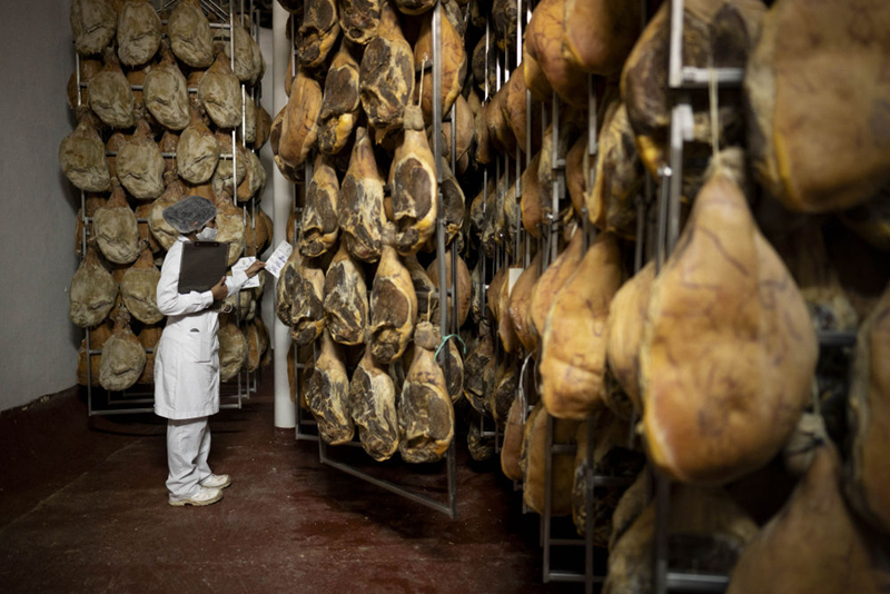 10月28日,在阿根廷首都布宜諾斯艾利斯附近的馬科斯·帕斯,一名工人檢查火腿的制作情況。這座人口僅有6萬(wàn)多人的小鎮(zhèn)以城市之名報(bào)名參加第三屆進(jìn)博會(huì)。新華社發(fā)(馬丁·薩巴拉攝)