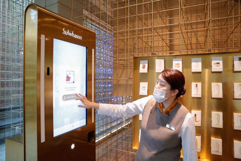 10月27日,工作人員在位于韓國(guó)首爾江南區(qū)的愛(ài)茉莉太平洋雪花秀旗艦店內(nèi)指導(dǎo)客人體驗(yàn)店內(nèi)設(shè)施。總部位于韓國(guó)首爾的美妝企業(yè)愛(ài)茉莉太平洋集團(tuán)今年將連續(xù)第三次參加進(jìn)博會(huì)。新華社記者 王婧嬙 攝