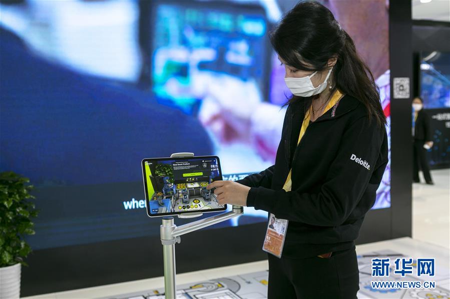 11月5日,在第三屆進(jìn)博會(huì)服務(wù)貿(mào)易展區(qū),德勤公司在中國(guó)首發(fā)“德勤小黃鴨智能工廠”,工作人員通過AR(增強(qiáng)現(xiàn)實(shí))技術(shù)展示智能工廠的應(yīng)用場(chǎng)景。 新華社記者 王翔 攝