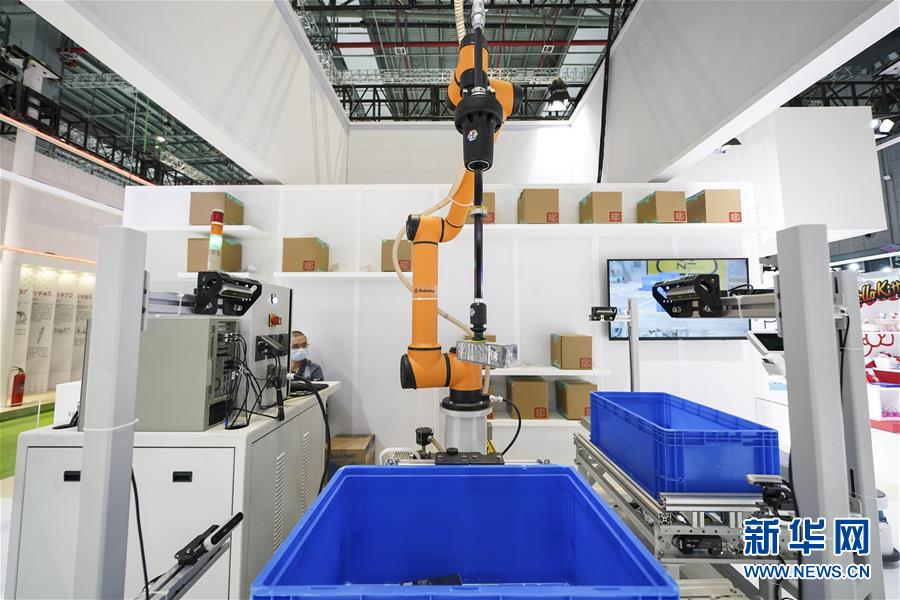 11月5日在第三屆進(jìn)博會(huì)服務(wù)貿(mào)易展區(qū)拍攝的物流分揀機(jī)器人。新華社記者 張豪夫 攝