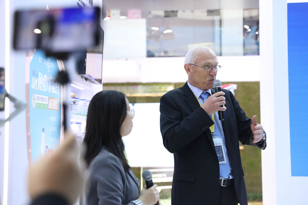 11月7日,羅伊在進(jìn)博會(huì)場館內(nèi)為合作伙伴介紹產(chǎn)品。