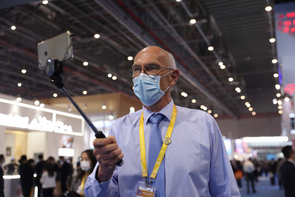 11月7日,羅伊在進(jìn)博會(huì)場館內(nèi)自拍留念。