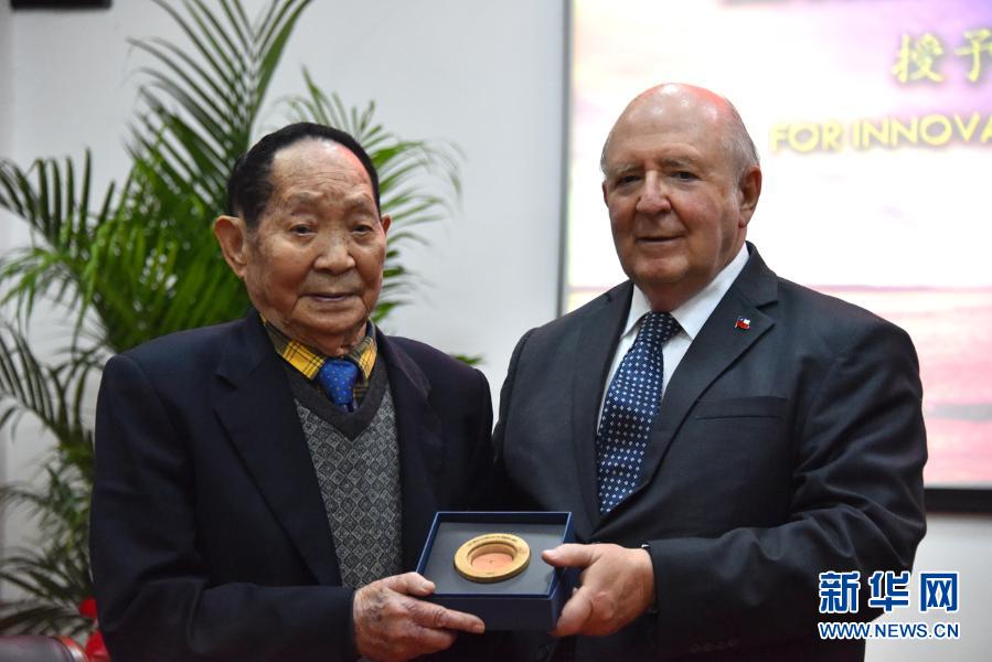 11月16日,智利駐華大使路易斯·施密特·蒙特斯向袁隆平頒發(fā)“中智建交50周年紀念獎章”。新華社記者 周勉 攝