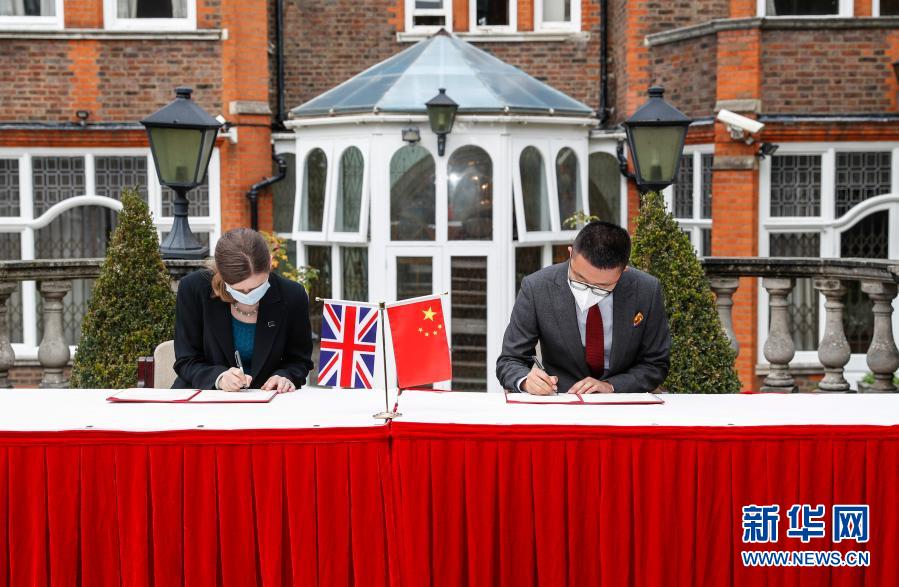 10月16日,在英國倫敦,代表中國國家文物局的中國駐英國大使館文化處一秘于果(右)和代表英國大都會警察局的探員蘇菲·海斯簽署文物接收確認書。新華社記者 韓巖 攝