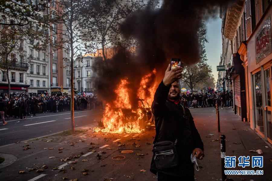 11月28日,在法國巴黎,一名男子在游行示威中被點(diǎn)燃的車輛前自拍。