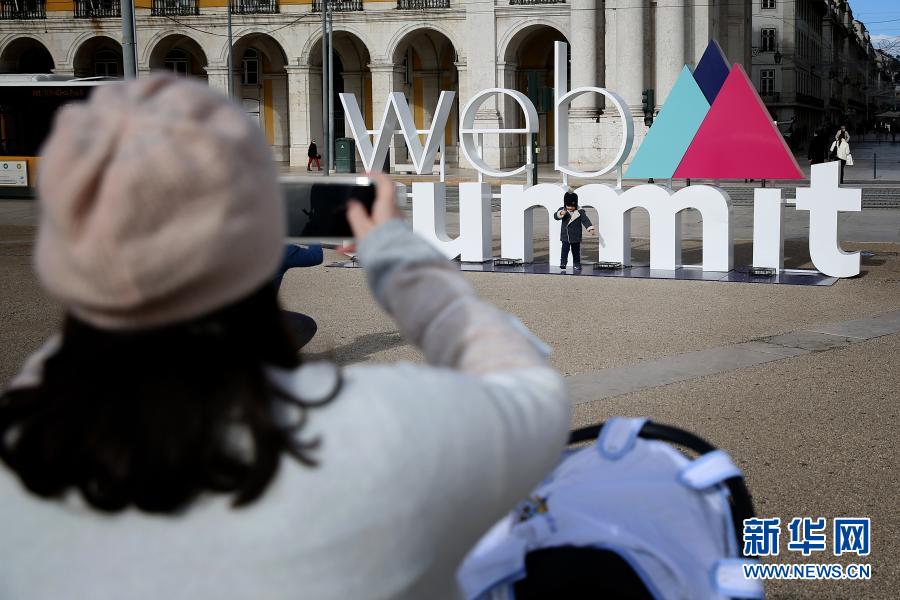 11月30日,在葡萄牙里斯本,一名兒童在2020年網(wǎng)絡(luò)峰會(huì)的立體標(biāo)識(shí)前留影。