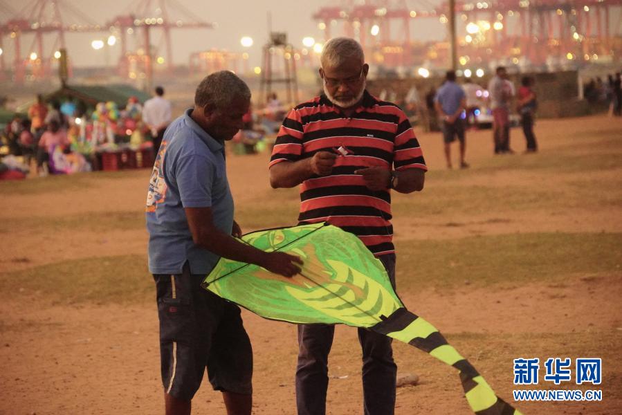 這張拍攝于2019年1月10日的資料照片顯示,納瓦在斯里蘭卡首都科倫坡加勒菲斯綠地廣場上調(diào)整風(fēng)箏。新華社記者 唐璐 攝