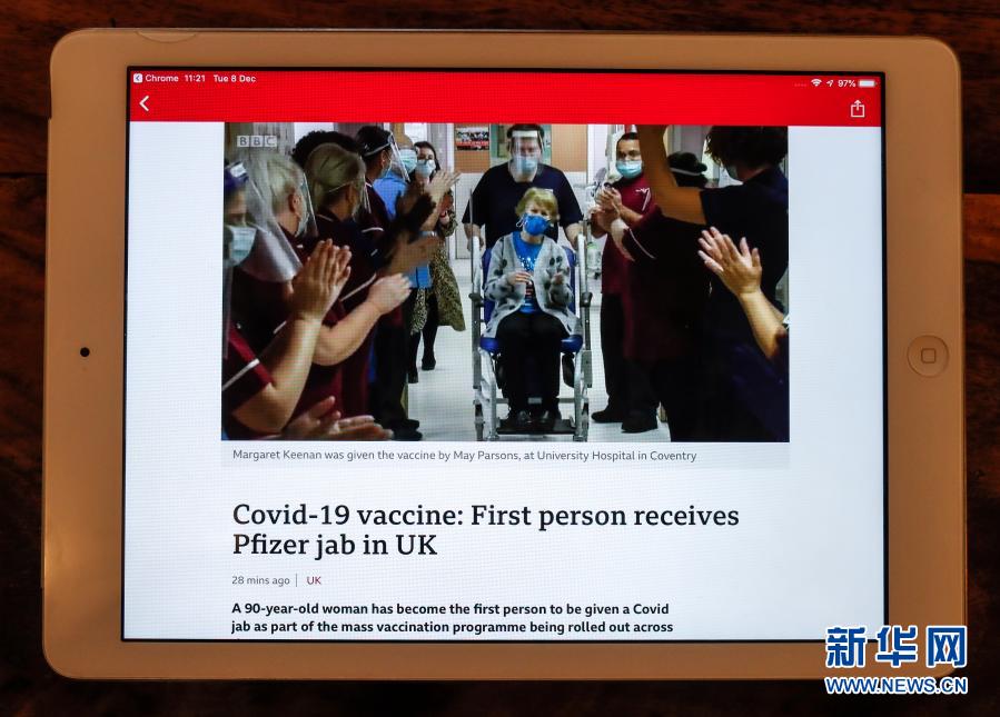 12月8日在英國倫敦拍攝的播放新聞的電腦屏幕顯示,醫(yī)護(hù)人員為該國首位接種新冠疫苗的90歲女子瑪格麗特·基南鼓掌。