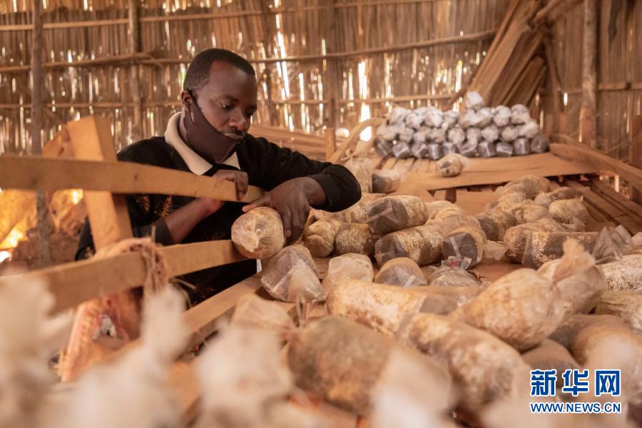 9月9日,在盧旺達(dá)首都基加利,埃馬紐埃爾·阿希馬納檢查菌袋。新華社發(fā)(西里爾·恩德格亞攝)