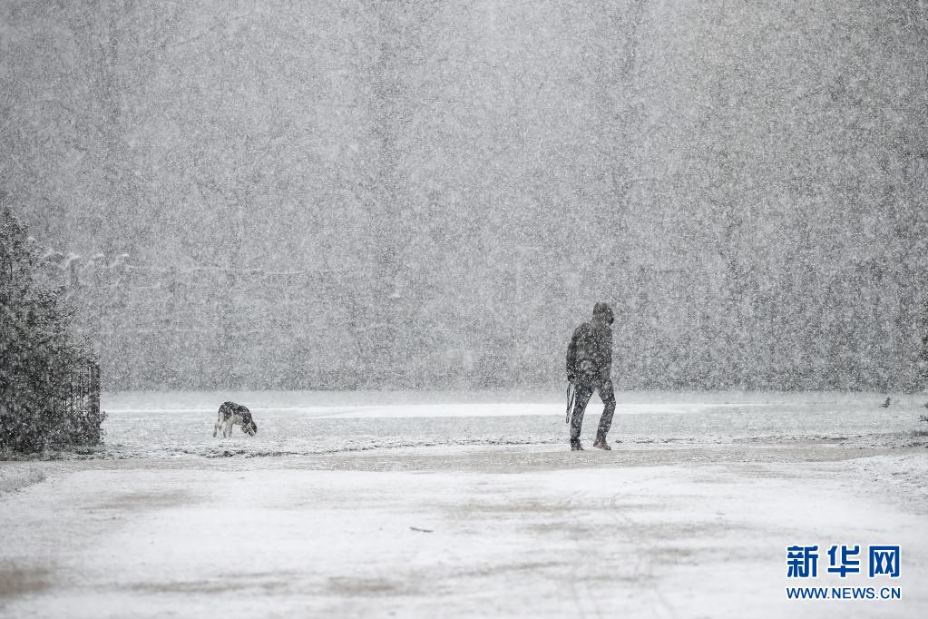4月6日,一名市民在比利時布魯塞爾五十周年紀念公園冒雪遛狗。