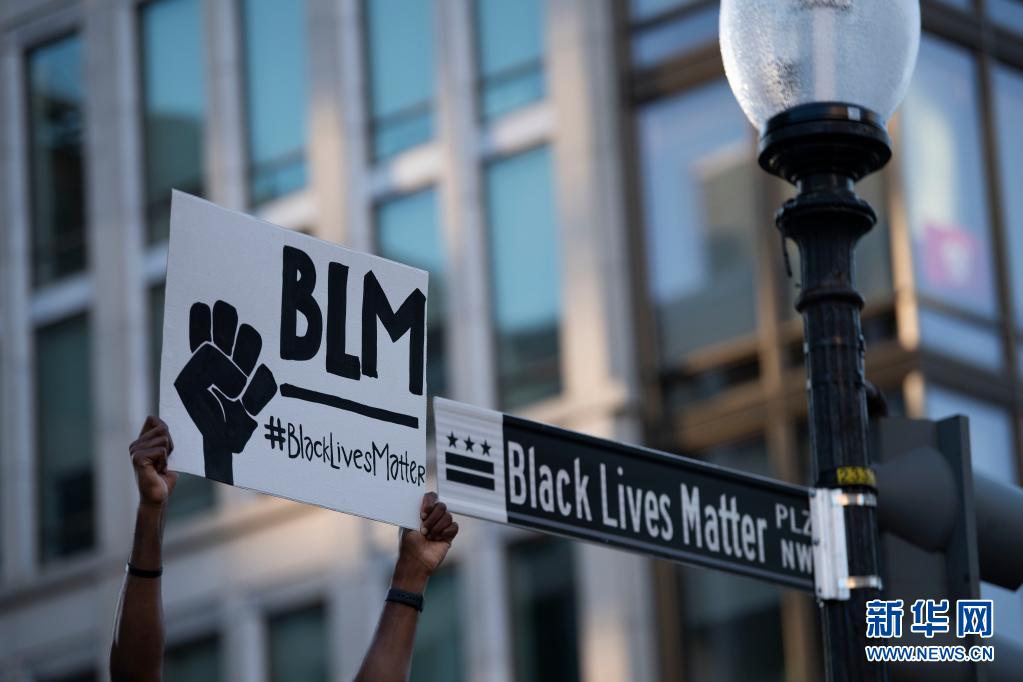 2020年6月8日,一名示威者在美國華盛頓白宮附近高舉“黑人的命也是命”的標(biāo)語。 新華社記者 劉杰 攝