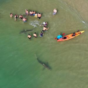 4月20日,在以色列北部城市哈代拉的海邊,鯊魚(yú)從人們身邊游過(guò)(無(wú)人機(jī)照片)。