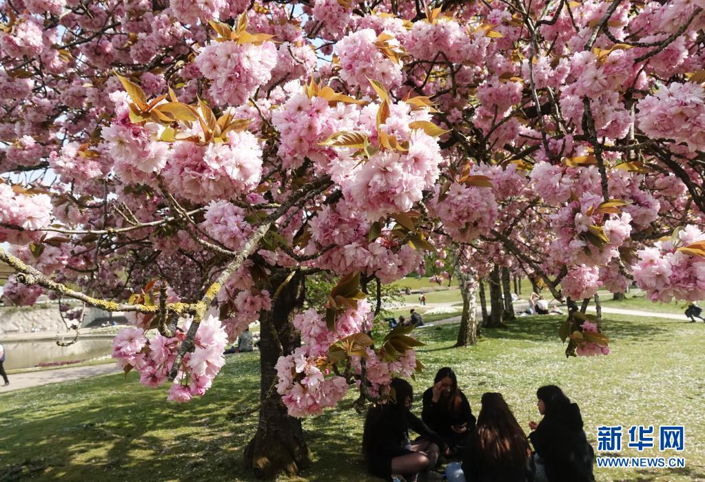 4月21日,人們?cè)诜▏屠枰惶幑珗@的櫻花樹下休閑。
