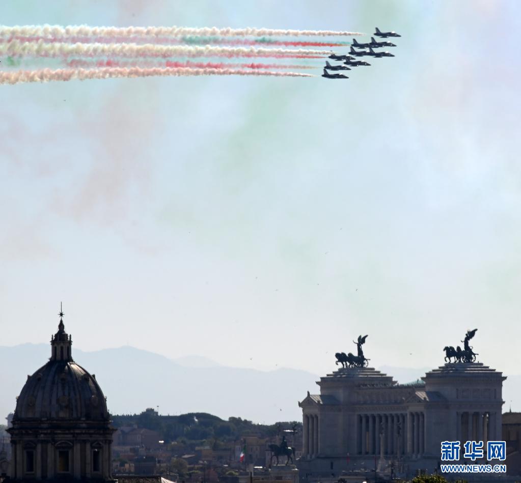 4月25日,意大利“三色箭”飛行表演隊(duì)在羅馬舉行的紀(jì)念儀式上噴出代表意大利國旗顏色的紅白綠三色煙霧。