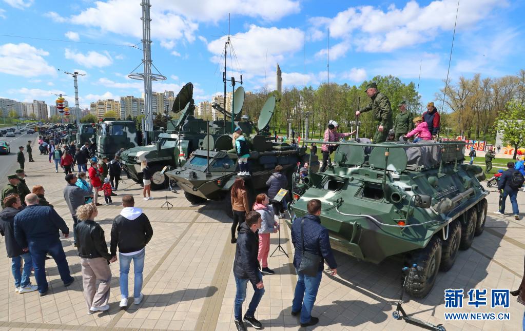 5月9日,參加勝利日節(jié)慶活動(dòng)的人們?cè)诎锥砹_斯首都明斯克參觀軍用車(chē)輛。