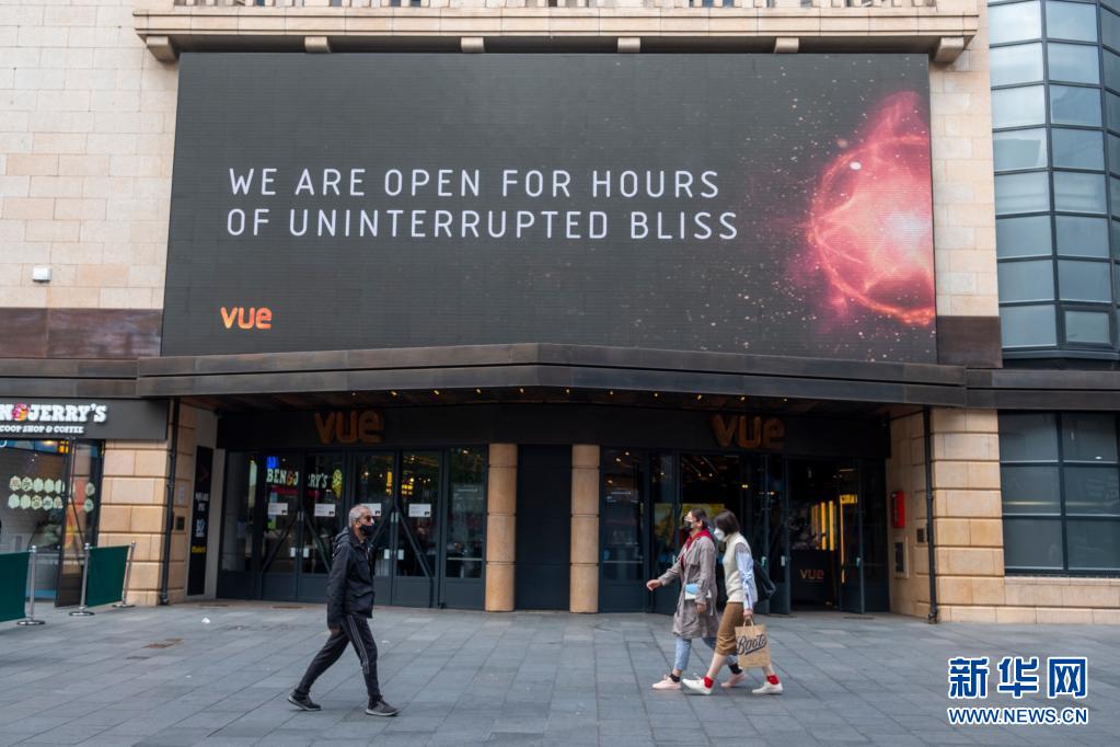 5月17日,人們從英國(guó)倫敦一家重開(kāi)的電影院門前走過(guò)。