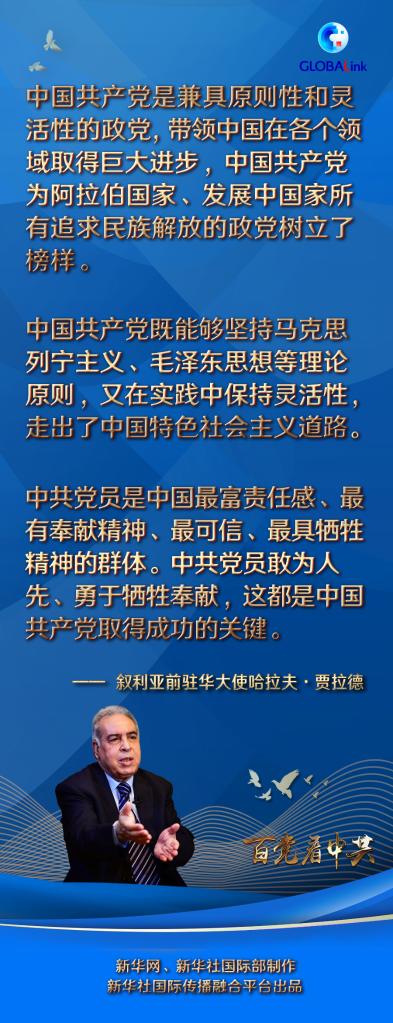 新華社大馬士革6月3日電(記者汪健 鄭一晗)敘利亞前駐華大使哈拉夫·賈拉德日前在大馬士革接受新華社記者專訪時說,中國共產(chǎn)黨是兼具原則性和靈活性的政黨,帶領中國在各個領域取得巨大進步,“中國共產(chǎn)黨為阿拉伯國家、發(fā)展中國家所有追求民族解放的政黨樹立了榜樣”。
