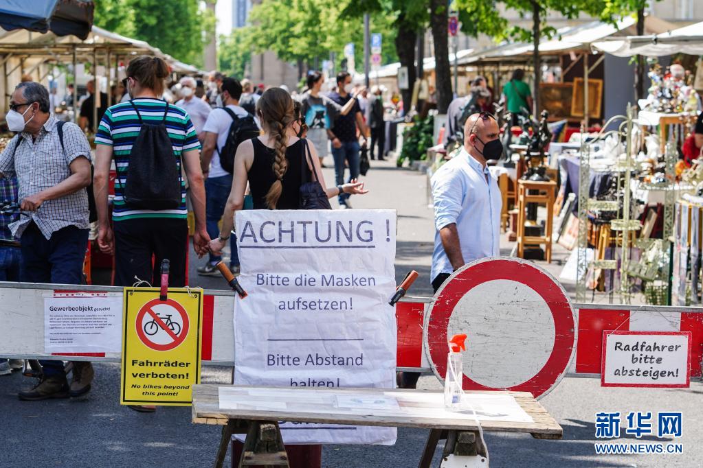6月6日,德國首都柏林一處“跳蚤市場”入口的告示牌提示人們佩戴口罩并保持社交距離。
