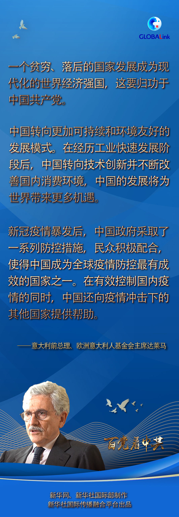 達萊馬先后擔(dān)任過意大利總理和外長等職,從20世紀(jì)70年代起多次訪問中國,見證了幾十年來中國的發(fā)展。