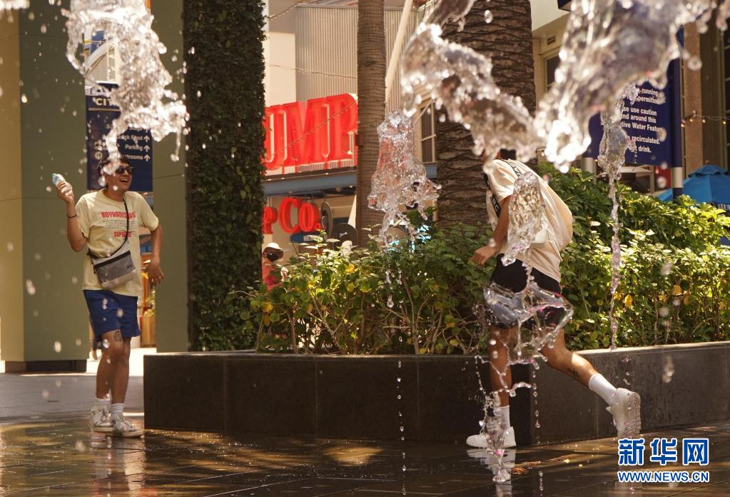 6月16日,美國加利福尼亞州洛杉磯市民在噴泉旁戲水納涼。加州南部本周迎來今年的首次高溫天氣。