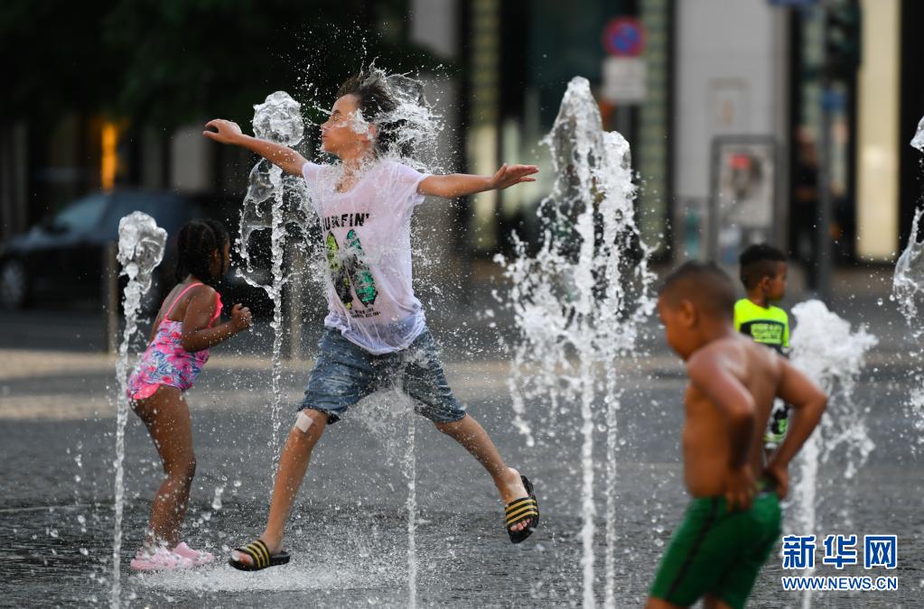 6月17日,小朋友在德國法蘭克福街頭戲水納涼。