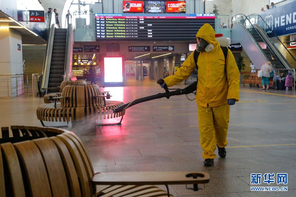 6月24日,工作人員身著防護(hù)服在俄羅斯莫斯科一個火車站進(jìn)行消毒作業(yè)。