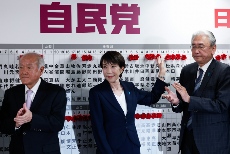 2026年2月8日,在日本东京的自民党总部,日本首相、自民党总裁高市早苗(中)将象征成功当选的红花贴在候选人名字上。新华社发(Pool图片,金敬勋摄)