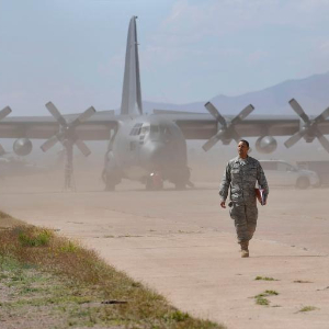 2010年4月21日,在美国亚利桑那州图森以南一处机场举行的2010“雷天使”军事搜救演习中,一名搜救人员走在C-130运输机前。新华社记者张军摄